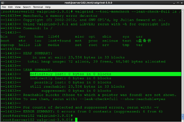 完成之后我們就可以對系統中的程序進行檢測了,首先我們用ls顯示根目錄下的文件,ls命令是沒有內存泄漏的: