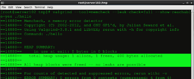 linux下檢測內存泄漏工具Valgrind簡介 在我們編寫C/C++的時候,最常見的錯誤之一就是內存泄露,這樣的問題其實跟程序員的編程習慣密不可分。如果你在虛擬主機申請內存空間之后能夠馬上在合適的位置釋放內存。會極大程度的避免內存泄漏的情況。但是人非圣賢,孰能無過。有時候我們確實忘記釋放內存而導致了比較嚴重的錯誤,所以這個時候我們需要借助valgrind這個工具來判斷內存泄漏。 Valgrind 是一款 Linux下(支持 x86、x86_64和ppc32)程序的內存調試工具,它可以對編譯后的二進制程序進行內存使用監測(C語言中的malloc和free,以及C++中的new和delete),找出內存泄漏問題。 Valgrind 中包含的 Memcheck 工具可以檢查以下的程序錯誤: 使用未初始化的內存 (Use of uninitialised memory) 使用已經釋放了的內存 (Reading/writing memory after it has been free’d) 使用超過malloc分配的內存空間(Reading/writing off the end of malloc’d blocks) 對堆棧的非法訪問 (Reading/writing inappropriate areas on the stack) 申請的空間是否有釋放 (Memory leaks – where pointers to malloc’d blocks are lost forever) malloc/free/new/delete申請和釋放內存的匹配(Mismatched use of malloc/new/new [] vs free/delete/delete []) src和dst的重疊(Overlapping src and dst pointers in memcpy() and related functions) 重復free valgrind的使用實例: 在官網上找到valgrind的tar包,解壓,編譯。完成后make安裝: