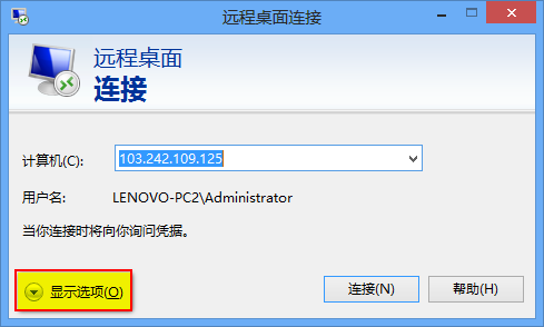 2、在”遠程桌面連接”窗口右下角,點擊”顯示選項”。