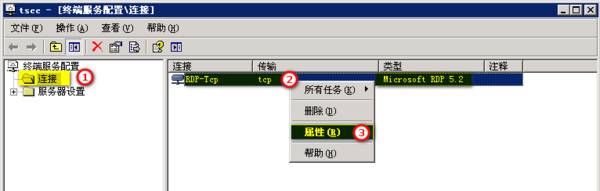6、在“終端服務配置\連接”的窗口中,終端服務配置 – “RDP-Tcp” – 屬性。
