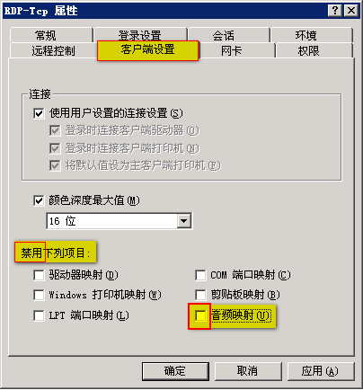 7、允許“音頻映射”。步驟:“客戶端設置”頁簽 - 禁用下列項目 – 去除“音頻映射” – 應用 – 確定。