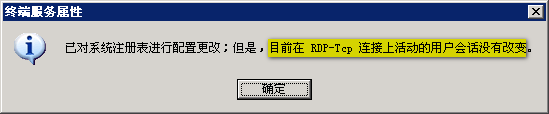 8、提示“已對系統注冊表進行配置更改;但是,目前在RDP-Tcp連接上活動的用戶會話沒有改變”,所以,需要注銷登錄,重新再登錄一次。