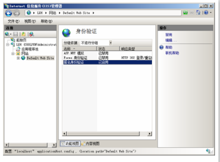 第二步,在站點主頁窗口中,選擇“身份驗證”,雙擊,顯示“身份驗證”窗口。默認情況下,“匿名身份驗證”為“啟用”狀態,如下圖所示: