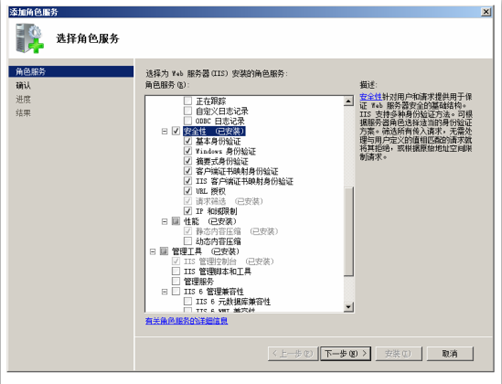 第一步,在“服務器管理器”窗口中,展開“角色”節點,選擇“Web 服務器(IIS)”,單擊“添加角色服務”,顯示如下圖所示的“選擇角色服務”窗口。在“安全性”選項區域中,可選擇欲安裝的身份驗證方式。
