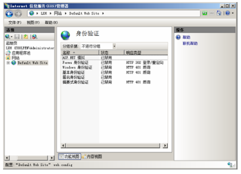 第二步,安裝完成后,打開 IIS 管理器,再打開“身份驗證”窗口,所經安裝的身份驗證方式顯示在列表中,并且默認均為禁用狀態,如下圖所示。