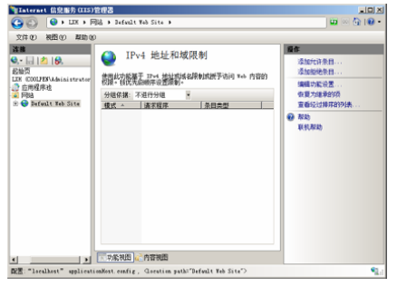 第一步,打開 IIS 管理器,選擇欲限制的 Web 站點,雙擊“IPv4 地址和域限制”圖標,顯示如下圖所示的“IPv4 地址和域限制”窗口。