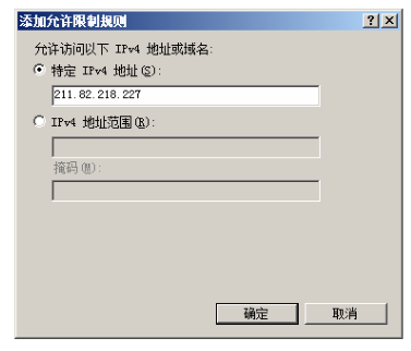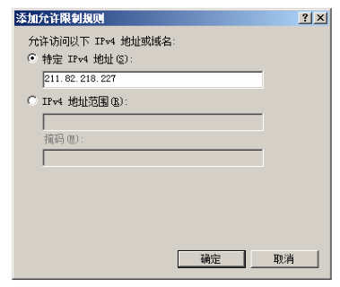 第二步,在右側“操作”任務欄中,單擊“添加允許條目”鏈接,顯示如下圖所示的“添加允許限制規則”窗口。如果要添加一個 IP 地址,可點選“特定 IPv4 地址”單選按鈕,并輸入允許訪問的 IP 地址即可;如果要添加一個 IP 地址段,可點選“IPv4 地址范圍”單選按鈕,并輸入 IP 地址及子網掩碼即可。