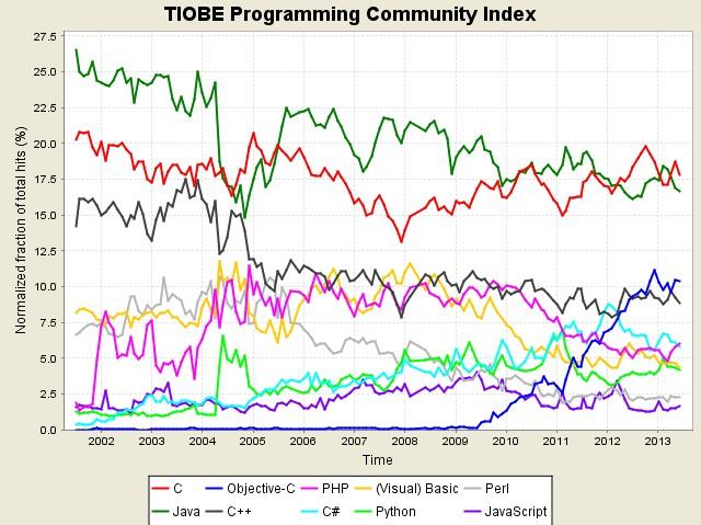 Tiobe公司發(fā)布新一期編程語言排行榜。從下面的編程語言排行中,我們不難看出PHP的攀登速度是最為迅速,跟2013年1 月份相比,PHP同比增長了+1.64%,其次就是數(shù)據(jù)庫語言的Transact-SQL(+0.99%)和PL / SQL(+0.34%)。 Tiobe公司認為,PHP上升的背后主要是來自于2012年9月發(fā)布最新的PHP Zend Framework。