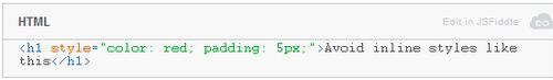 人們經(jīng)常將設(shè)計風(fēng)格放入線上的HTML里,但是這樣會把語義標(biāo)記和風(fēng)格搞混淆。分離關(guān)注點的同時還消除了緩存和重復(fù)使用CSS的機(jī)會。DRY原理在這里比較適用:如果你想把一個風(fēng)格使用在多個點上,那就需要事先聲明這個風(fēng)格是在一個單獨的樣式表里的。