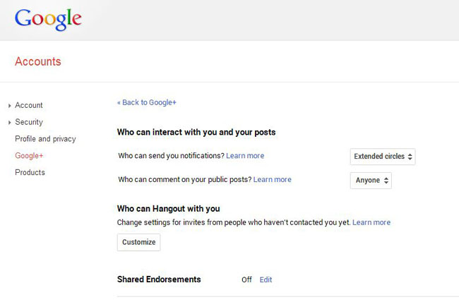 谷歌反復(fù)強(qiáng)調(diào)一點(diǎn):用戶(hù)始終能夠控制所分享的內(nèi)容。所以,如果你不喜歡這樣,那么可以進(jìn)入 Google+ 的 Shared Endorsements setting 里面修改。你只要花一點(diǎn)時(shí)間,把該功能關(guān)閉即可: