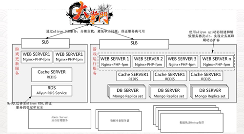 2、在關鍵路徑上,部署主備集群,通過負載均衡服務SLB分發并對外提供服務,避免單點故障帶來的游戲不可用。游戲更新和運行服務均體現了這一點。