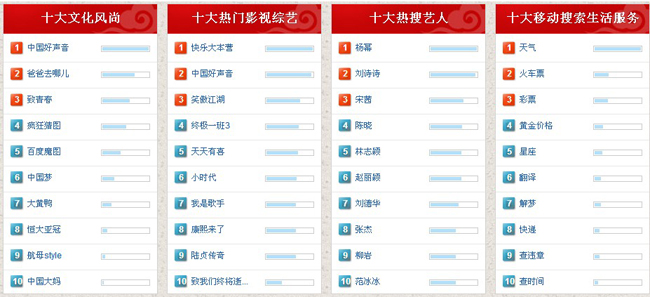 百度2013年搜索風(fēng)云榜包括8個主榜單和16個特色榜單,其中主榜單囊括2013十大搜索熱詞、十大上升最快事件、十大話題人物、十大網(wǎng)絡(luò)流行語、十大文化風(fēng)尚、十大熱門影視綜藝、十大熱搜藝人、十大移動搜索生活服務(wù)。
