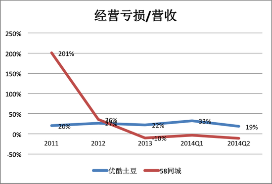 從2011年算起,到2014年上半年,58同城、優(yōu)酷土豆累計虧損分別為9100萬美元、2.84億美元,它們每虧損1美元換來的市值分別為37美元和15美元。