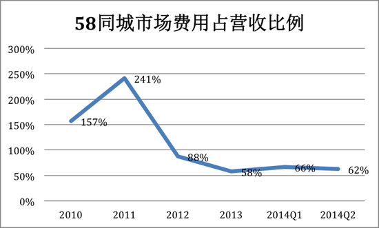 巨額的廣告投放,數(shù)千人的線下業(yè)務員團隊使58同城市場費用占營收的比例居高不下。2011年市場費用突破1億美元,相當于營收的241%,此后有所回落。2013年及2014年前六個月,基本穩(wěn)定在營收的60%左右。