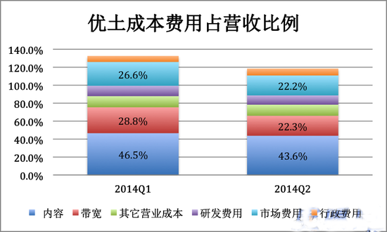 優(yōu)酷土豆的三大負擔是內容、帶寬及市場費用,2014年Q2分別相當于營收的43.6%、22.3%和22.2%。