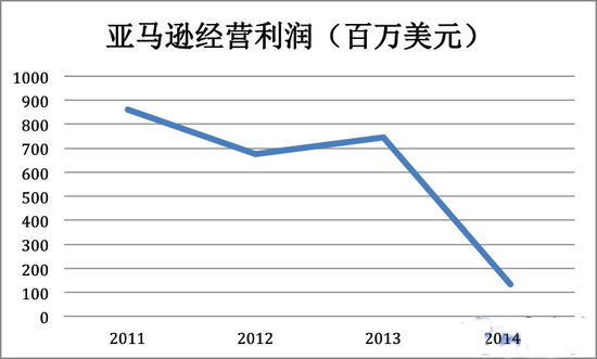 亞馬遜以利潤換市場不假。營收從2011年的481億美元增到2014年上半年的391億美元。同期,經(jīng)營利潤從8.6億美元降至1.3億美元。