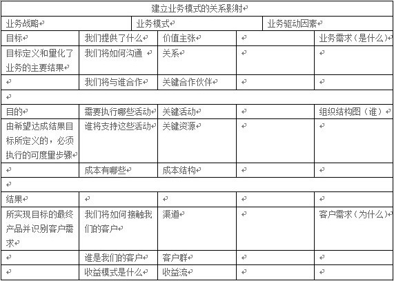 其結果就是一個標識從業務到生產輸出所需輸入的框架。業務模式的輸入包括:關系、價值主張、關鍵活動、關鍵資源、關鍵合作伙伴以及成本結構。其輸出包括:渠道、收益流以及客戶群。圖1顯示了使用關系影射方法根據業務戰略制定業務模式的一個示例。