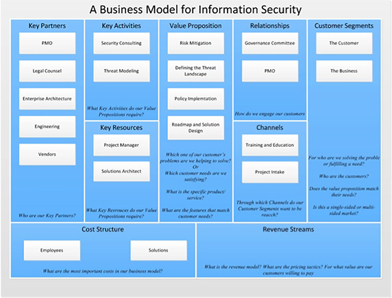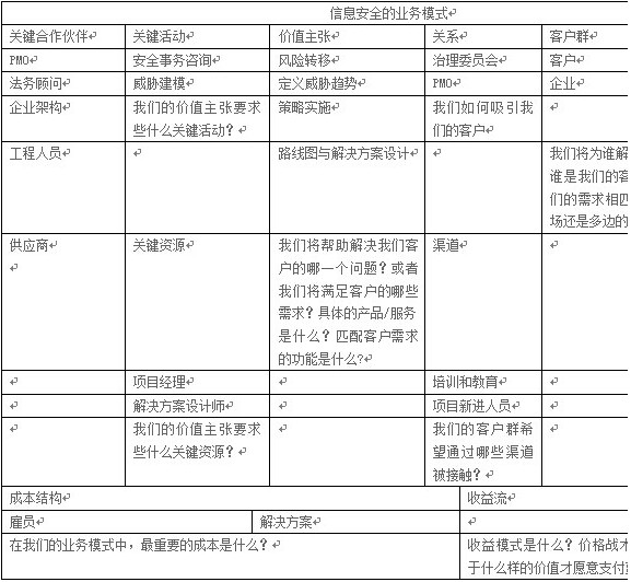 業務價值主張從本質上來說是動態的,而保護計劃業務模式則是相對靜態的。關鍵資源是可控因素(例如,團隊),它提供了價值主張。關鍵合作伙伴是那些在企業內部你希望他們提供業務驅動因素的人。圖2顯示了一個可跨多個行業使用的安全計劃的業務模式。