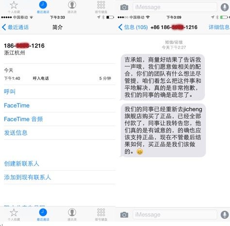 2、截至2014年11月11日14:00為止,分別有自稱是代表天貓公關公司的人和天貓小二的人打電話來要求我不要把天貓員工穿盜版衛衣的真相向媒體披露,但為何截至目前,我們還沒有收到官方的正式致歉?