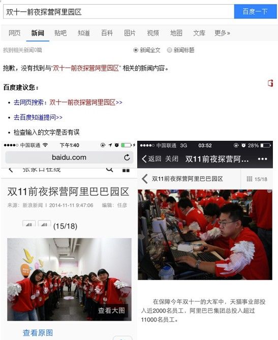 3、網上已經搜不到新浪原發的“雙十一前夜探營阿里園區”的專題圖片新聞,只能搜到其他媒體轉載的,請問貴公司真的是很有誠意在和我們溝通嗎?