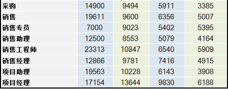 整體而言,媒體相關(guān)薪水較低,商務(wù)相關(guān)則薪水較高。在各職位1-3年經(jīng)驗(yàn)薪水中:售后客服、銷售助理、售前咨詢等職位薪水最低。