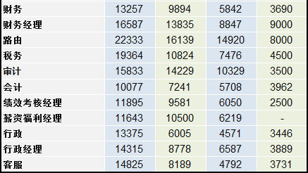 在職能類職位中,會(huì)計(jì)的薪水較低,5年以上工作經(jīng)驗(yàn)月薪只有1萬左右。薪水最高的當(dāng)然是稅負(fù)、IT支持及法務(wù)。