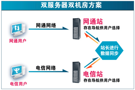 實際是一個網站分別租用兩個服務器,分別放在電信機房和網通機房, 然后讓電信用戶訪問電信站點,網通用戶訪問網通站點。這樣讓用戶獲得最好的網絡速度。