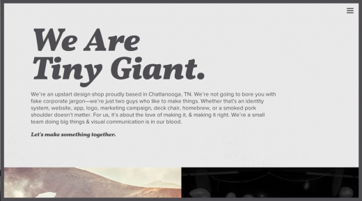 2014年,字體在許多網(wǎng)站設(shè)計中發(fā)揮重要作用,我未發(fā)現(xiàn)這種趨勢在短期內(nèi)改變的跡象。可是2015年,我看到網(wǎng)站中的標(biāo)題和字體變得越來越大。夸張地說,就連天上的飛機可能都能看到地面上的字。當(dāng)你訪問Tiny Giant的網(wǎng)站時,你會看到很大的字體。這實際上是一種聲明,讓你很難錯過。大字體將繼續(xù)在2015年的網(wǎng)站設(shè)計中發(fā)揮重要作用,成為確保提高訪客視覺層次的方法。訪客首先會看到最大的字體,因為那會首先吸引你的注意力。