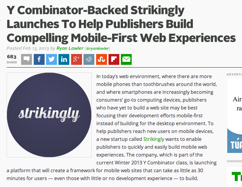 當Strikingly已經用盡了身邊的朋友以及朋友的朋友后,網站的增長到達了一個瓶頸期。這時團隊找到一些相對垂直且小型的科技媒體和創業媒體講述自己的故事,這些媒體也比較樂意來發布產品相關的信息和介紹。得到第一輪的PR之后,團隊把目標轉向主流的大眾媒體。可是大眾媒體一般不愿意報道一個這么早期的產品。團隊沒有放棄,用google搜索,goole api和mturk等人工的方法搜到了一堆媒體的聯系方式。一家一家去聯系,給每一家媒體都寫十分個性化的郵件,講自己的故事。最后終于有一家紐約時報愿意報道他們的故事。在被紐約時報報道了之后,再聯系其它媒體就變得容易多了。就這樣,他們上了50多家主流媒體,獲取了頭2萬名用戶的增長。