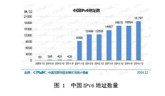 截至2014年12月,我國IPv6地址數量為18,797塊/32,年增長12.8% 。