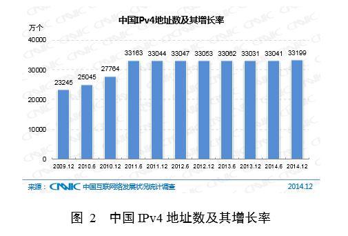 全球IPv4地址數已于2011年2月分配完畢,自2011年開始我國IPv4地址總數基本維持不變,截至2014年12月,共計有33199萬個。