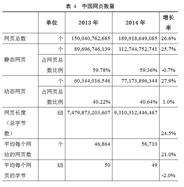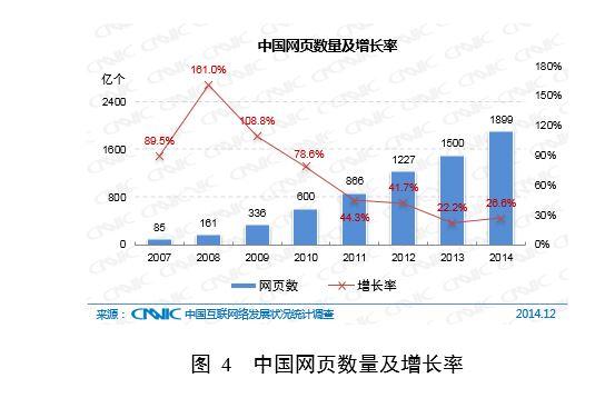 截至2014年12月,中國網頁數量為1899億個,年增長26.6% 。