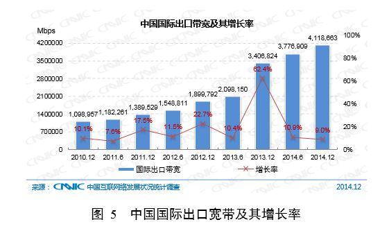 截至2014年12月,中國國際出口帶寬為4,118,663 Mbps,年增長率為20.9% 。