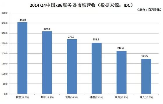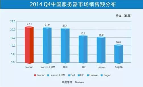浪潮服務(wù)器官方,在3月10日發(fā)布官方信息稱:根據(jù)Gartner公司公布的最新X86服務(wù)器市場調(diào)查數(shù)據(jù)顯示,2014年第四季度中國X86服務(wù)器銷售額達(dá)到112.6億元人民幣,同比增速為24.4%,浪潮以19.5%的份額位居市場第一。2014年浪潮已經(jīng)兩度獲得市場第一。