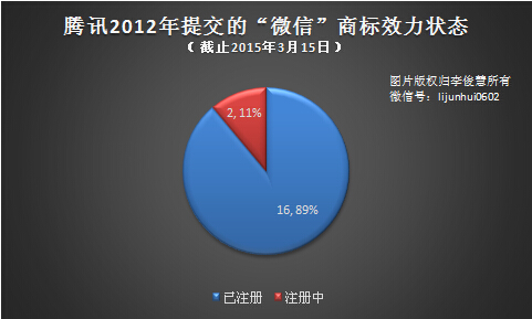 從商標(biāo)效力狀態(tài)看,截止2015年3月15日,騰訊2012年提交的18件“微信”注冊(cè)商標(biāo),已有16件完成注冊(cè),另有2件依舊處于“注冊(cè)中”狀態(tài),分別為38類和43類。