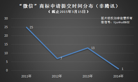 從申請(qǐng)時(shí)間來(lái)看,非騰訊公司提交的“微信”商標(biāo)注冊(cè)申請(qǐng),集中發(fā)生在兩個(gè)年份2011年和2013年。簡(jiǎn)單說(shuō),在微信面世第一個(gè)年頭,微信在騰訊內(nèi)部的地位處于由“邊緣向核心”過(guò)渡階段,騰訊自身并未在此階段啟動(dòng)“微信”商標(biāo)周邊類別或跨類別保護(hù)注冊(cè)。但是,微信的用戶,顯然比騰訊更敏銳,一些公司或個(gè)人在此期間陸續(xù)提交了25件“微信”商標(biāo)申請(qǐng)。