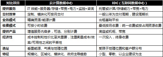 二者從提供的服務最能說明差異。IDC常見的有兩類,一類是托管型服務。即服務器由客戶自行購買安裝,期間對設備的監控和管理工作也由客戶自行完成。數據中心主要提供IP接入,帶寬接入和電力供應等服務。即提供服務器運行的物理環境,簡寫為:提供IP+寬帶+電力;另一類是數據中心不僅提供管理服務,也向客戶提供服務器和存儲,客戶無需自行購買設備就可以使用數據中心所提供的存儲空間和計算環境。同時,相關IT咨詢服務也可以幫助客戶選擇最適合的IT解決方案以優化IT管理結構。即:服務器/存儲+咨詢+自動化的管理和監控+IP/帶寬/VPN