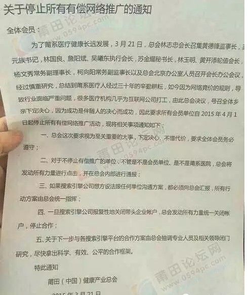 3月25日微博賬號(hào)@北冥乘海生爆料,莆田(中國(guó))健康產(chǎn)業(yè)總會(huì)向所有莆田系醫(yī)療機(jī)構(gòu)發(fā)放通知,要求協(xié)會(huì)中所有機(jī)構(gòu)停止在互聯(lián)網(wǎng)上的有償網(wǎng)絡(luò)推廣。這份由“中國(guó)健康總會(huì)”發(fā)出的內(nèi)部會(huì)議通知顯示:“經(jīng)過(guò)慎重研究,莆田醫(yī)療人經(jīng)過(guò)三十年的辛勤耕耘,如今因?yàn)榫W(wǎng)絡(luò)競(jìng)價(jià)規(guī)則,導(dǎo)致產(chǎn)業(yè)面臨嚴(yán)重問(wèn)題,很多醫(yī)療機(jī)構(gòu)幾乎為互聯(lián)網(wǎng)公司打工,因此總會(huì)決定,號(hào)召全體鄉(xiāng)親停止有償網(wǎng)絡(luò)推廣活動(dòng)。”