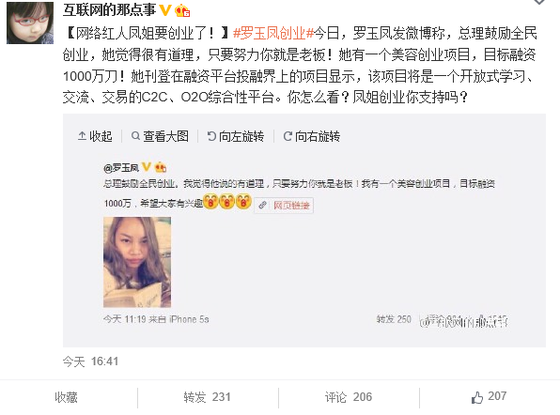 做生意70年代叫下海,10年后叫創(chuàng)業(yè)。2015年3月國務(wù)院總理李克強(qiáng)在政府工作報(bào)告中提出“互聯(lián)網(wǎng)+”戰(zhàn)略,一大波創(chuàng)業(yè)新軍在前在后紛紛崛起。4月20日,身在美國的網(wǎng)絡(luò)紅人羅玉鳳微博自曝,欲在投融界上融資千萬打造跨國美業(yè)O2O平臺(tái)。羅玉鳳想靠融資闖入炙手可熱的美業(yè)O2O,僅靠跨國平臺(tái)的噱頭夠不夠資格一戰(zhàn)?