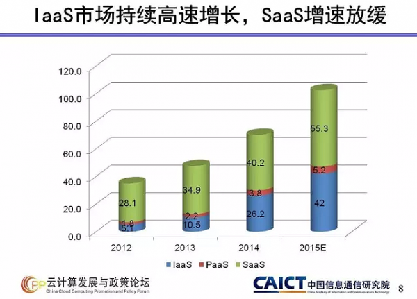 云計(jì)算發(fā)展調(diào)查報(bào)告》。報(bào)告指出,2015年我國(guó)公共云服務(wù)總收入預(yù)計(jì)將達(dá)到102.5億元,同比增長(zhǎng)46%;IaaS市場(chǎng)總收入預(yù)計(jì)將達(dá)42億元,同比增長(zhǎng)逾60%,增勢(shì)迅猛。