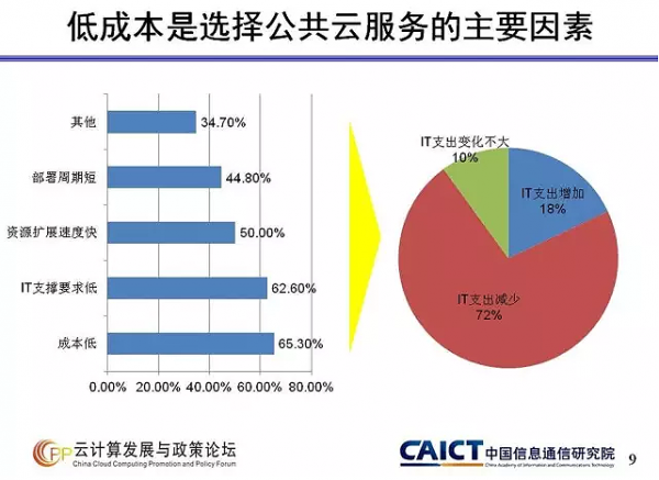 報(bào)告還進(jìn)一步指出,“相對(duì)較低的成本”是用戶選擇公共云服務(wù)的主要因素,有65.3%的受訪者選擇了這一答案。此外,選擇“IT支撐要求低”“資源擴(kuò)展速度快”“部署周期短”的用戶同樣,分別達(dá)到62.6%、50%和44.8%。72%的公共云服務(wù)用戶認(rèn)為,采用公共云服務(wù)后,自己的IT支出變得更少;10%用戶認(rèn)為自己的IT支出變化不大,相對(duì)持平,只有18%的用戶認(rèn)為自己的IT支出有所增加。在服務(wù)的性價(jià)比方面,超過七成用戶對(duì)國(guó)內(nèi)的公共云服務(wù)“比較滿意”或“很滿意”,只有0.8%的用戶覺得性價(jià)比較差。