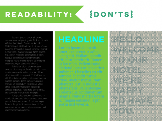 正如同上文所說,影響可讀性的影響因素很多,不過在諸多問題當中,確保可讀性的基礎是可讀——至少要讓人看清元素本身。在黑色的背景上采用白色的字體一般能保證可讀性,對比很明顯,但是如果字體太過于纖細,視覺上的辨識度就很低了。字體過小、色彩對比度不夠、透明度過高都會造成類似的問題,只要你發現難于識別,有針對性地處理即可。