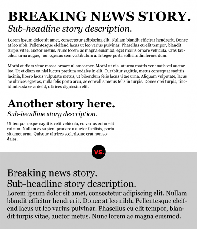 有時候你需要強化某個部分,會在視覺上進行強調,讓它從整個設計中脫穎而出。文字部分常見的手法很多,斜體、粗體、下劃線、大寫、增大字體大小,等等。但是千萬不要將所有的強調方式都用在同一篇文字同一個段落中,這樣會讓它看起來凌亂不堪。