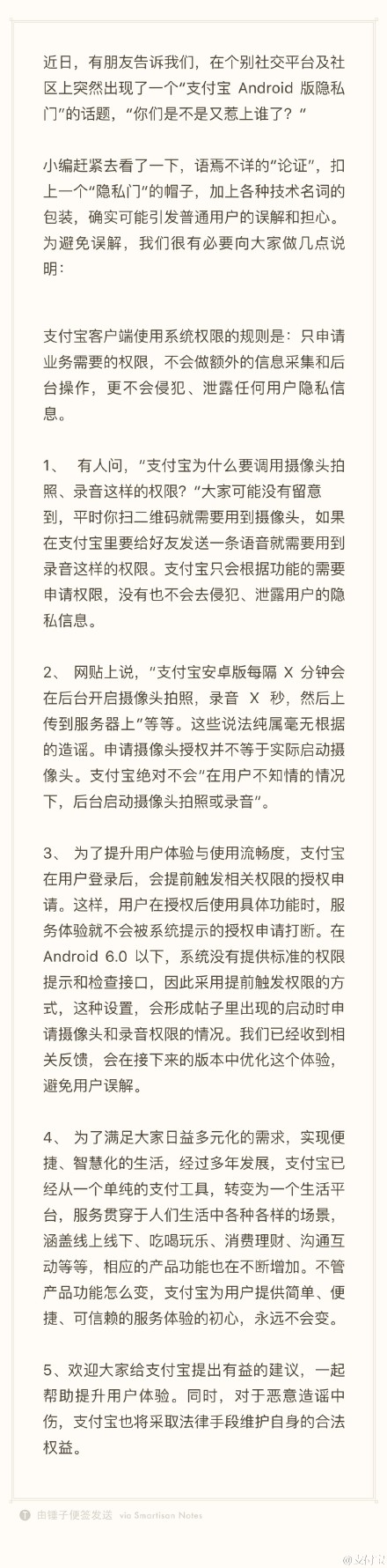 支付寶方面今日通過官方微博發(fā)表回應(yīng)稱,個別社交平臺的“支付寶Android版隱私門”話題,用語焉不詳?shù)摹罢撟C”,扣上一個“隱私門”的帽子,加上各種技術(shù)名詞的包裝,確實可能引發(fā)普通用戶的誤解和擔心。支付寶只申請業(yè)務(wù)需要的權(quán)限,不會做額外的信息采集和后臺操作,更不會侵犯、泄露任何用戶隱私信息。