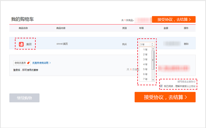 第四步:進入【購物車】,確認域名內容是否正確,選擇【注冊年限】,閱讀【新網域名注冊協議】