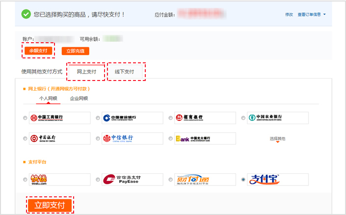 第七步:您有多種支付方式可選:余額支付、網上支付、線下支付,點擊立即支付,完成支付