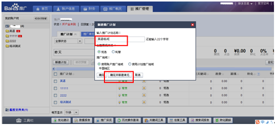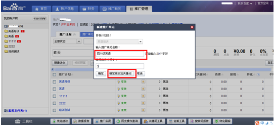 新建好計劃后,輸入推廣單元的名稱,并為剛剛提交的單元設定一個出價。設置好“單元出價”后,點擊“確定并添加關鍵詞”,即可進入提交關鍵詞頁面。(單元的出價是對單元中所有關鍵詞的出價。例如,您新建了“四六級英語”單元,為這個單元設置的出價為“3”元,那么“四六級英語”整個單元里所有關鍵詞的出價都是“3”元。以后如果需要修改出價,可以在推廣單元里修改,也可以直接的關鍵詞中修改)。