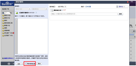 您可以自己直接輸入關鍵詞,也可以采用系統自動推薦的優質關鍵詞。保存之前,可選擇匹配模式,若勾選“同時新增創意”,可直接撰寫創意。