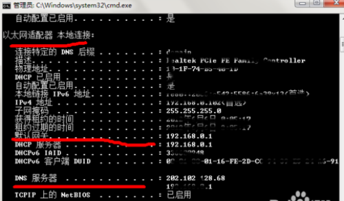 (3)如果(2)沒有問題,那你再輸入ping 你的網(wǎng)關(guān)地址,即你的路由器地址或者交換機(jī)的網(wǎng)關(guān)地址,一般為192.168.0(或者1).1。網(wǎng)關(guān)具體獲取方法是在命令行輸入ipconfig/all,然后找到你當(dāng)前連接網(wǎng)絡(luò)類型對應(yīng)的網(wǎng)關(guān)地址,如圖:圖中第二條紅線