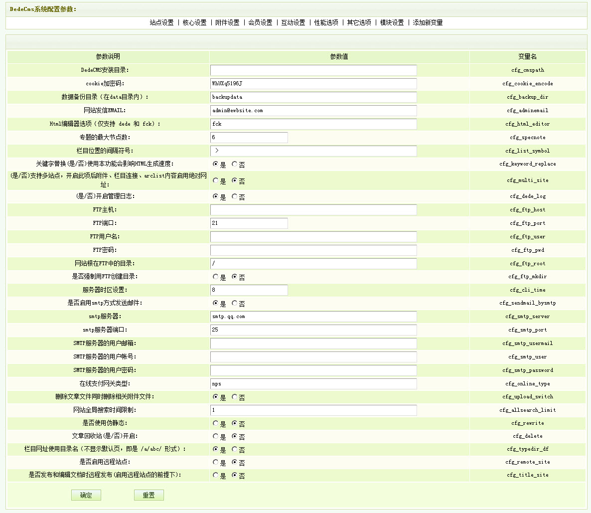 定準到核心設置頁面,頁面分參數說明、參數值、變量名三列顯示設置項目,其中變量名可在模板用global+變量名進行調用,例如內容模板里調用網站名稱{dede:global.cfg_webname/}。